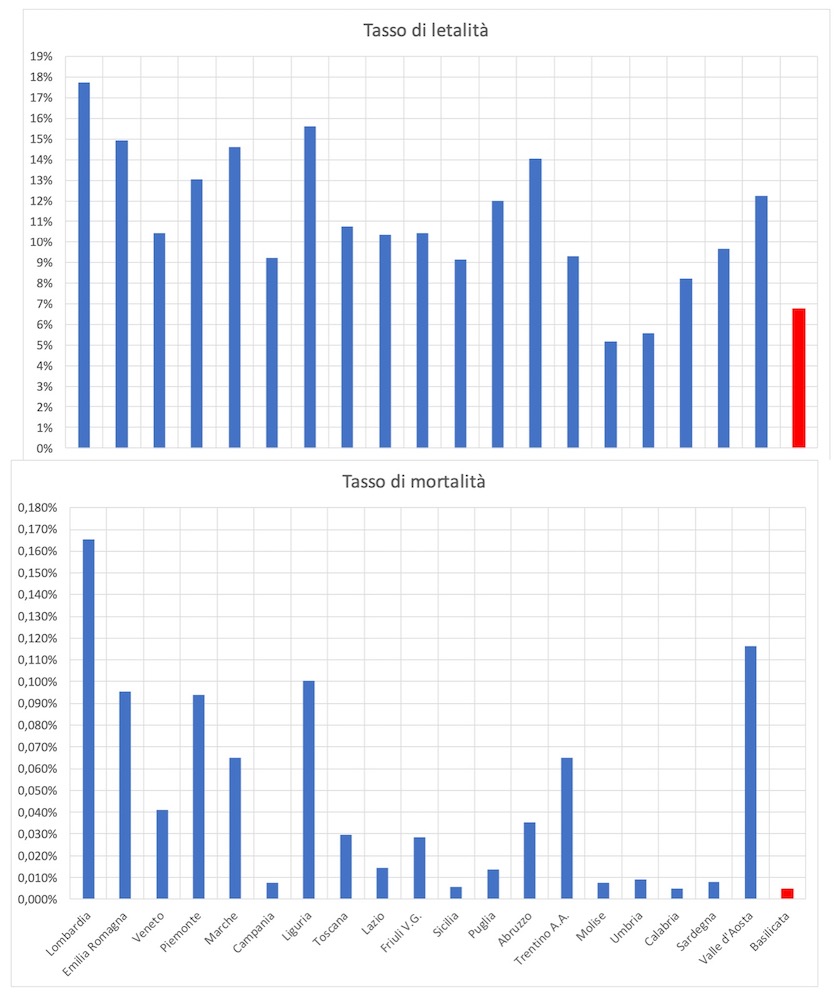Le osservazioni positive già effettuate sono confermate dai valori assunti dai tassi di letalità (6,77%) e di mortalità (0,0048%), il primo superiore alle sole Umbria e Molise e il secondo inferiore a tutte le Regioni.