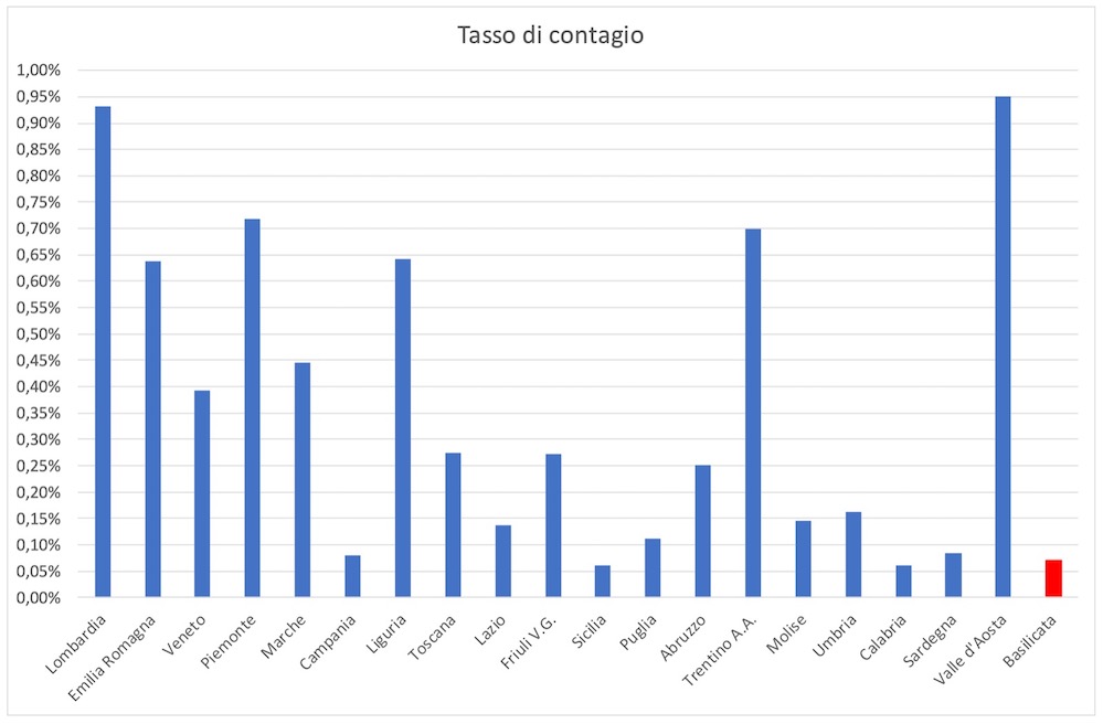 Allo stato la Basilicata è tra le Regioni che meglio hanno saputo contenere il contagio, attestandosi quest’ultimo sul valore dello 0,71‰ dell’intera popolazione, secondo solo alla Calabria e alla Sicilia.