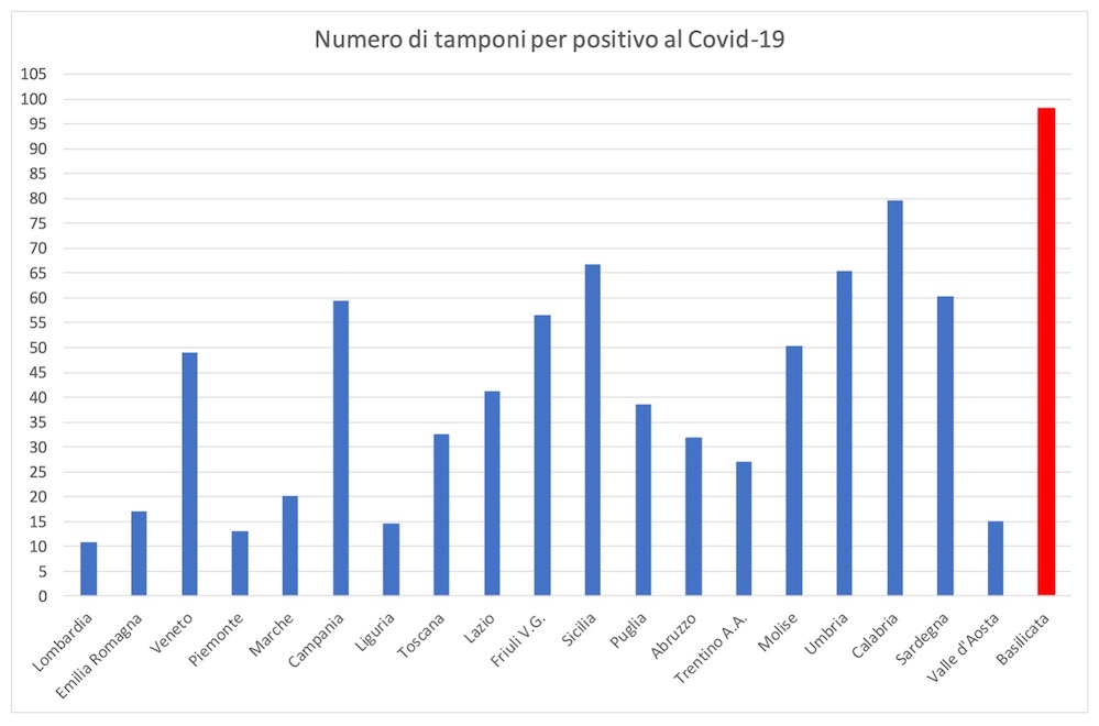 Maggiore significatività ha la relazione tra tamponi effettuati e numero di positivi al Covid-19 in Regione. Considerando detta relazione, risulta evidente che la Basilicata ha effettuato un numero di 98,1 tamponi per ciascun positivo, valore in continuo miglioramento e ben maggiore di quello delle Regioni più colpite dal contagio (Lombardia, Emilia Romagna, Piemonte, Marche) incluso il Veneto (49,0 tamponi per positivo), che pure è riconosciuto come la Regione più attiva nell’effettuazione deitamponi. La Regione Basilicata è quella che fa segnalare il valore più elevato In Italia.