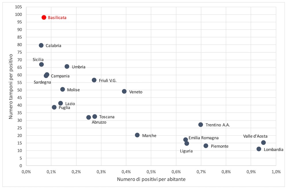 La performance della Regione Basilicata in termini di tamponi effettuati è evidente anche ponendo in correlazione il tasso di positivi sulla popolazione con il numero di tamponi effettuati per positivo.