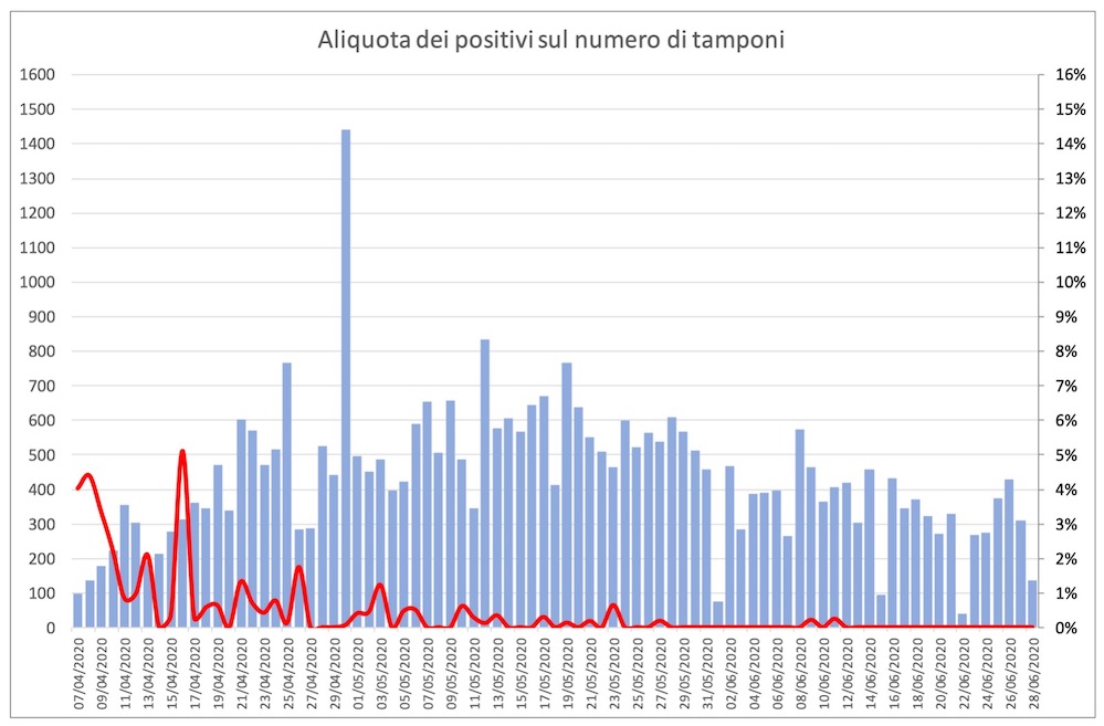 Va sottolineato, tuttavia, come nelle ultime tre settimane il numero di tamponi giornaliero si è piuttosto ridotto.