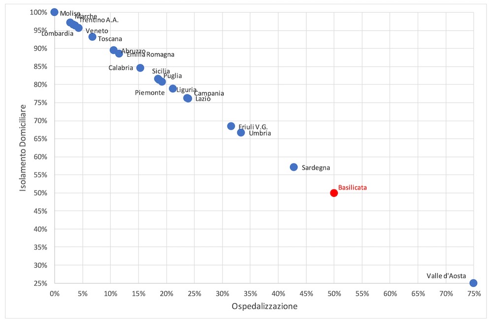 Riportando in un diagramma le modalità con cui le diverse Regioni stanno garantendo l’assistenza sanitaria ai contagiati da Covid-19 si evince chiaramente il differente approccio, con estremi costituiti dalla Regione Molise (100% dei positivi in isolamento domiciliare) e dalla Regione Valle d’Aosta (25% dei positivi in isolamento domiciliare e 75% ospedalizzato).
