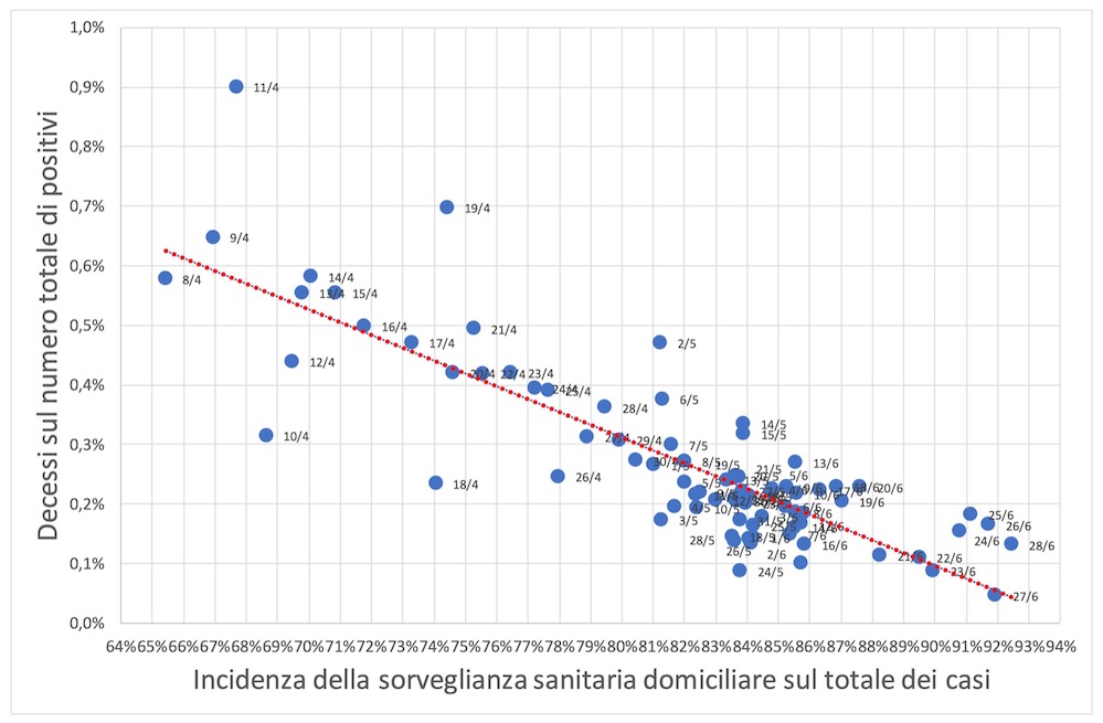 Sembra pertanto che maggiore è l’incidenza dell’assistenza domiciliare sul totale dei casi positivi, minore è il numero di decessi. In circa tre mesi l’incidenza della sorveglianza sanitaria domiciliare è cresciuta di circa il 30% e, al contempo, si è passati da un numero di decessi pari al 6‰ dei casi positivi al significativamente più contenuto valore dello 0,5‰.