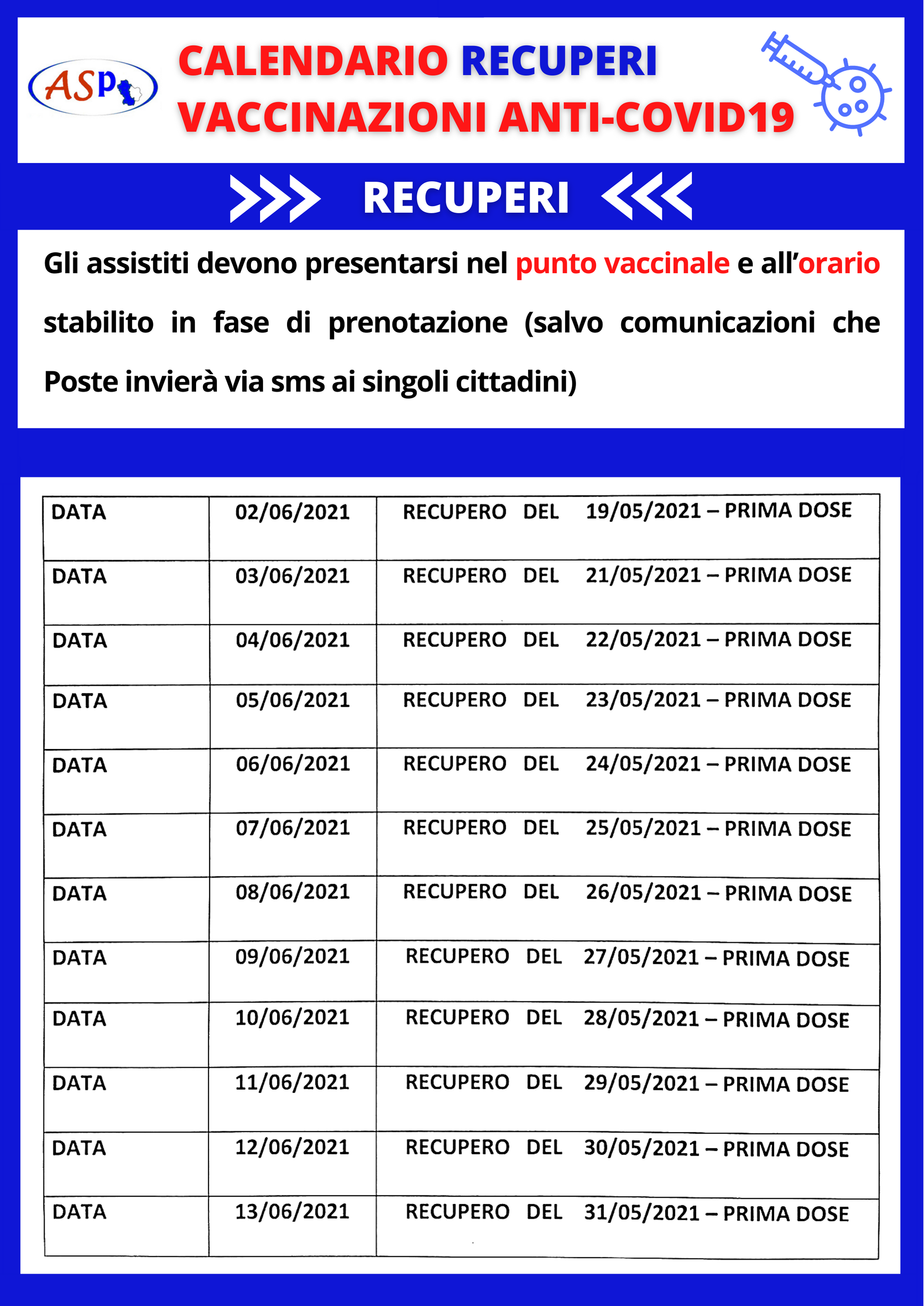 Martedì 1 giugno 2021 – Di seguito il calendario dei recuperi delle vaccinazioni sospese nel mese di maggio. Si precisa che gli assistiti devono presentarsi nel punto vaccinale e all’orario stabilito in fase di prenotazione (salvo comunicazioni che Poste invierà via sms).