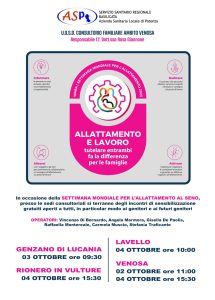 Si apre oggi la “Settimana Mondiale per l’Allattamento al Seno” con iniziative che interessano anche le sedi del Consultorio Familiare dell’Ambito venosino. Presso le sedi consultoriale di Venosa, Genzano di Lucania, Rionero e Lavello si terranno incontri di sensibilizzazione aperti a tutti e gratuiti, e rivolti in particolar modo ai futuri neo genitori.