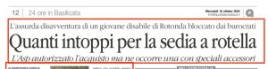 In riferimento all’articolo “Quanti intoppi per la sedia a rotelle” pubblicato sul Quotidiano del Sud, esaminata la documentazione, giunge risposta da parte dell’Azienda Sanitaria Locale di Potenza relativamente all’iter autorizzativo.