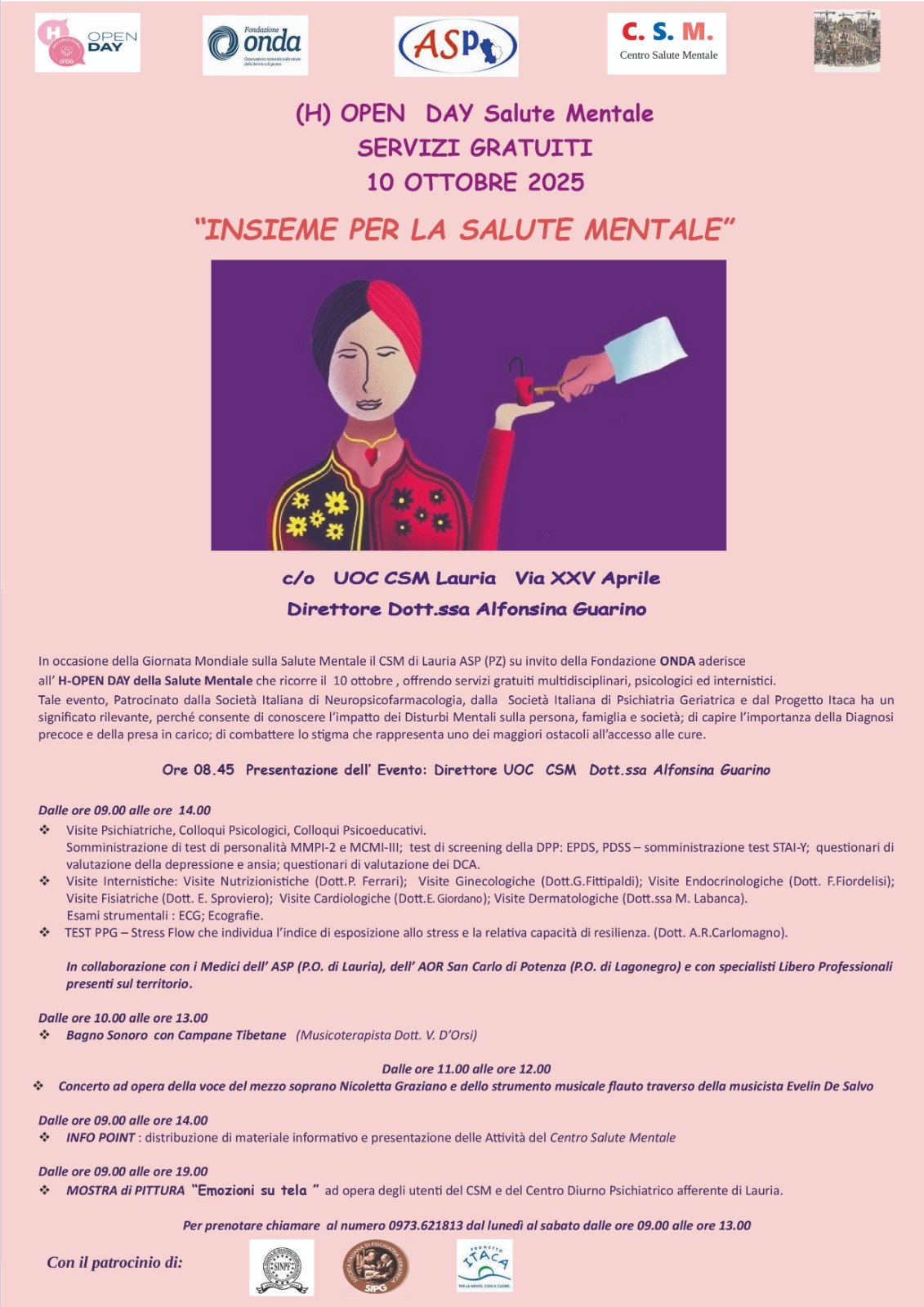 In occasione della Giornata Mondiale sulla Salute Mentale il CSM di Lauria ASP (PZ) su invito della Fondazione ONDA aderisce all’H-OPEN DAY della Salute Mentale che ricorre il 10 Ottobre, offrendo servizi gratuiti multidisciplinari, psicologici e internistici.